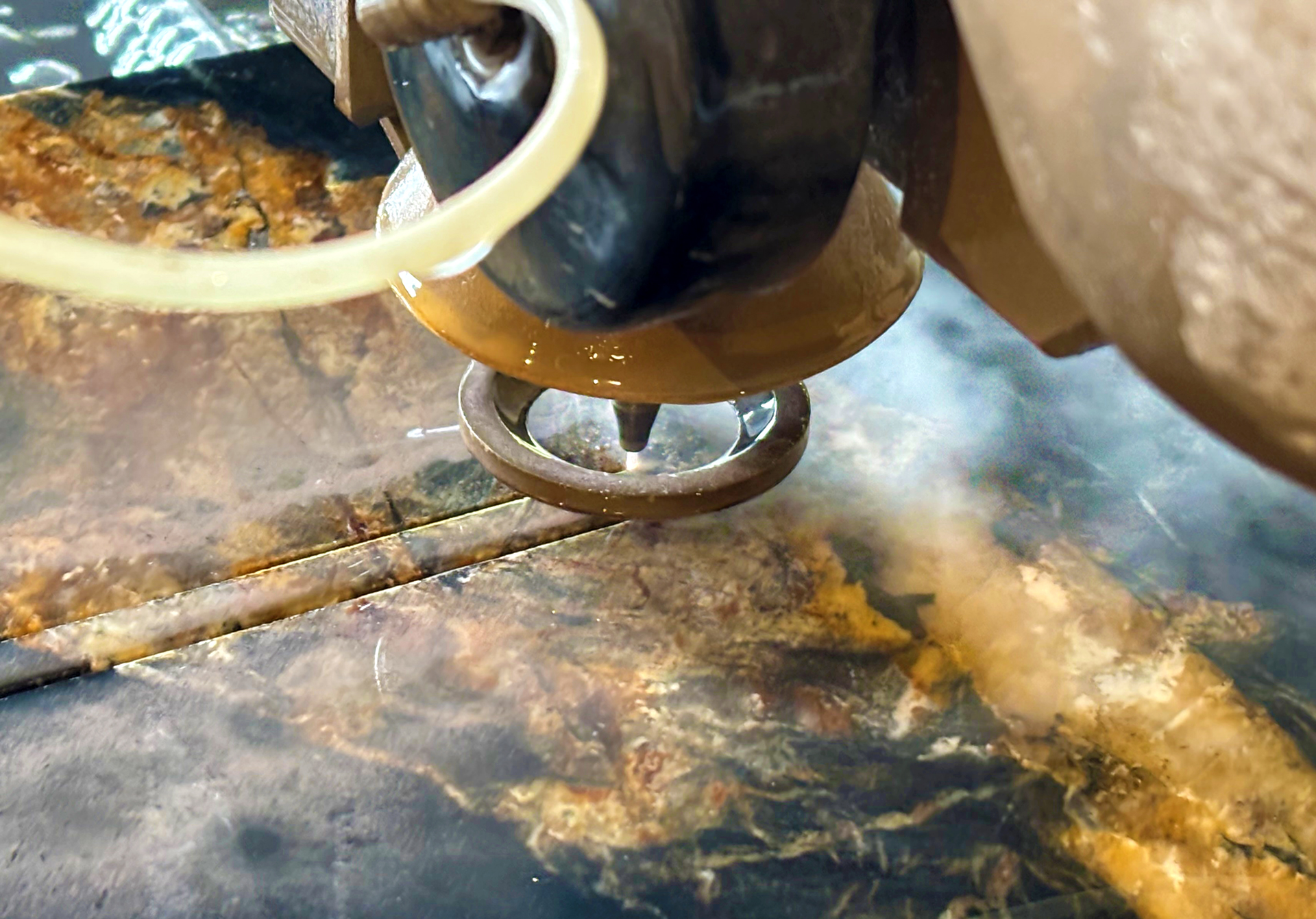 In unserem Steinmetzbetrieb setzen wir auf die neueste Technologie, um selbst härteste Materialien schonend und präzise zu bearbeiten: die Wasserstrahlschneidemaschine. Diese innovative Methode nutzt einen Hochdruckwasserstrahl – mit bis zu 4000 Bar – dem ein Abrasivschleifmittel, der sogenannte Schneidesand, beigemischt wird. Dadurch können wir nahezu jedes Material bearbeiten: von Naturstein über Keramik und Metall bis hin zu Glas und Kunststoff.